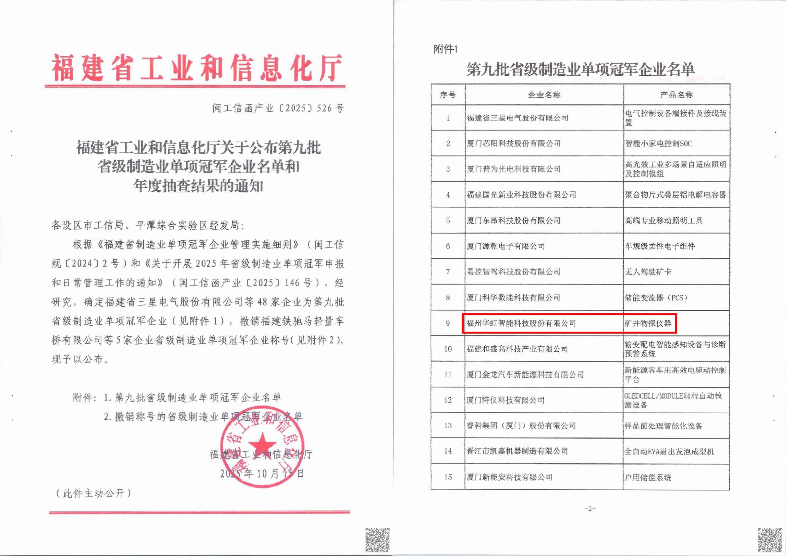 近日,福建省工业和信息化厅发布《关于公布第九批省级制造业单项冠军企业名单和年度抽查结果的通知》(闽工信函产业[2025]526号),福州华虹智能科技股份有限公司凭借“矿井物探仪器”成功入选第九批省级制造业单项冠军企业名单,彰显其在该细分领域的领先实力。